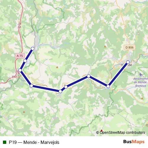 The first stop of the P19 bus route is Mende and the last stop is Marvejols. P19 (Mende - Marvejols) is operational during everyday.