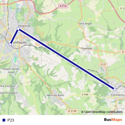 The first stop of the P23 bus route is Urcay Hôtel du Lyon d'Or and the last stop is Montluçon. P23 is operational during everyday.