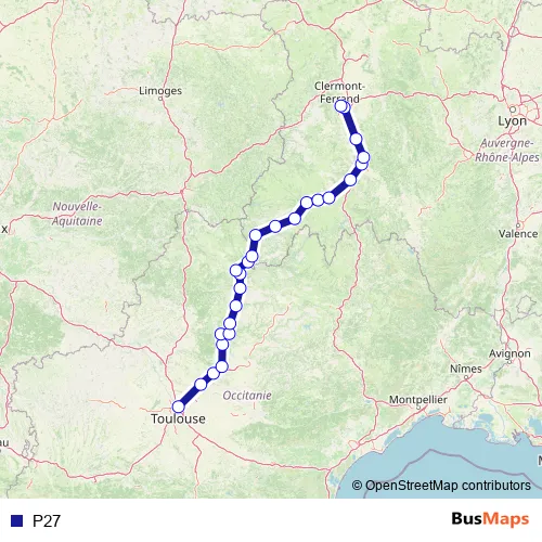 The first stop of the P27 rail route is Toulouse-Matabiau and the last stop is Clermont-Ferrand. P27 is operational during everyday.