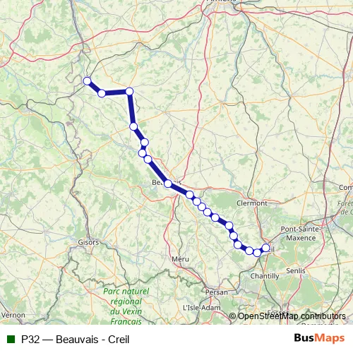 The first stop of the P32 rail route is Creil and the last stop is Beauvais. P32 (Beauvais - Creil) is operational during everyday.