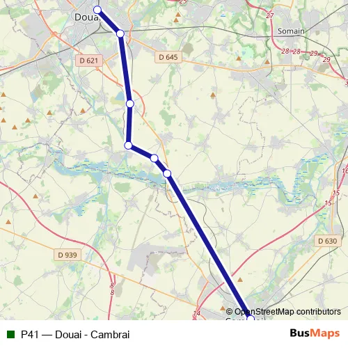 The first stop of the P41 rail route is Cambrai and the last stop is Douai. P41 (Douai - Cambrai) is operational during everyday.