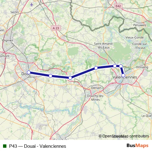 The first stop of the P43 rail route is Douai and the last stop is Valenciennes. P43 (Douai - Valenciennes) is operational during everyday.