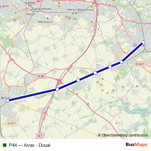 The first stop of the P44 rail route is Arras and the last stop is Douai. P44 (Arras - Douai) is operational during everyday.