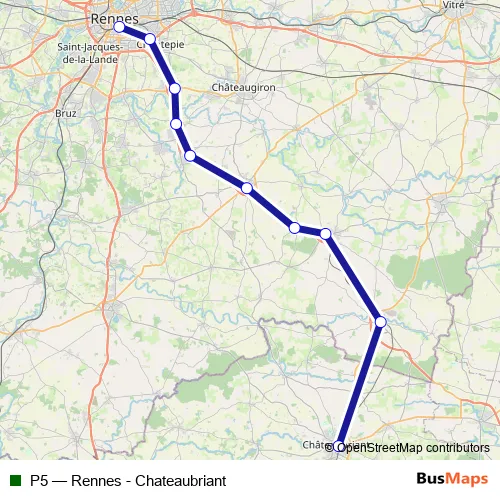 The first stop of the P5 rail route is Châteaubriant and the last stop is Rennes. P5 (Rennes - Chateaubriant) is operational during everyday.