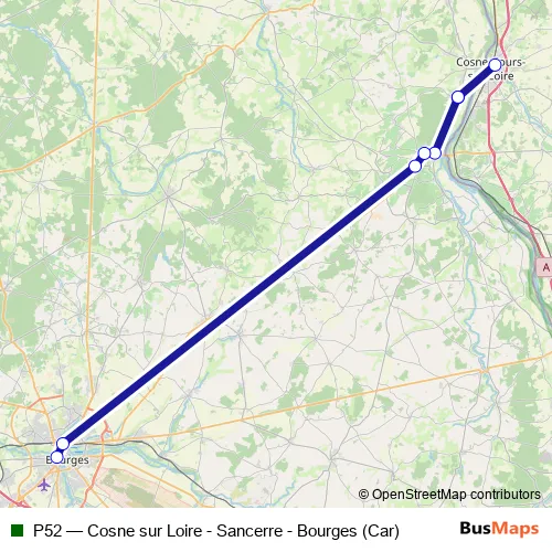 The first stop of the P52 bus route is Cosne-sur-Loire and the last stop is Bourges Gare Routière. P52 (Cosne sur Loire - Sancerre - Bourges (Car)) is operational during everyday.