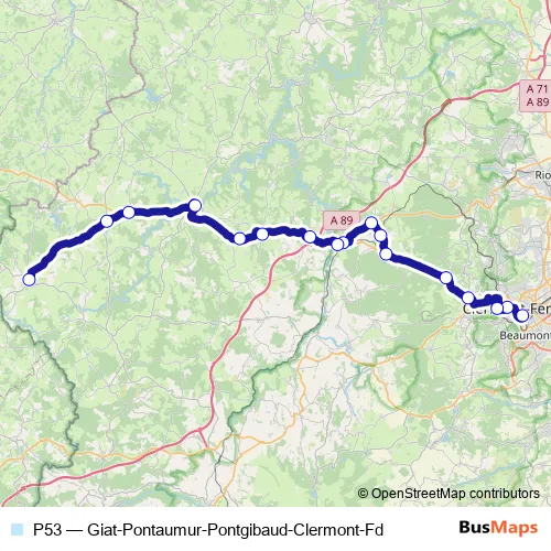 The first stop of the P53 bus route is Gare Routière and the last stop is Bourg - Mairie. P53 (Giat-Pontaumur-Pontgibaud-Clermont-Fd) is operational during everyday.