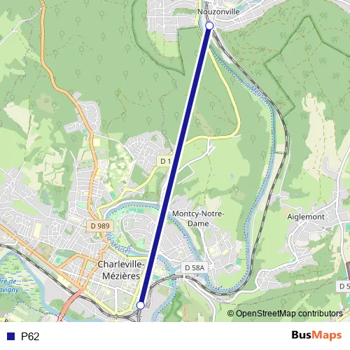 The first stop of the P62 bus route is Nouzonville and the last stop is Charleville-Mézières. P62 is operational during on weekdays.