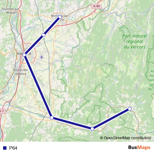 The first stop of the P64 bus route is Romans - Bourg-de-Péage and the last stop is Die. P64 is operational during everyday.