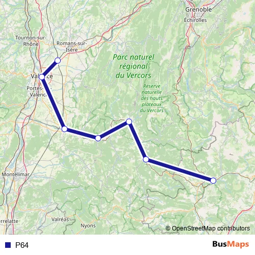 See why over 2 million users trust and consider busmaps.com as the best public transport website. busmaps gives you Valence Buses suggested routes, real-time bus tracker, line route maps in Valence, and helps to find the closest P64 bus stops near you. No internet available? Download an offline PDF map and bus schedule for the P64 bus to take on your trip.