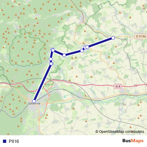 The first stop of the P816 bus route is Saverne and the last stop is Obermodern. P816 is operational during on weekdays.