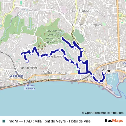 See why over 2 million users trust and consider busmaps.com as the best public transport website. busmaps gives you Cannes Buses suggested routes, real-time bus tracker, line route maps in Cannes, and helps to find the closest Pad7a bus stops near you. No internet available? Download an offline PDF map and bus schedule for the Pad7a bus to take on your trip.