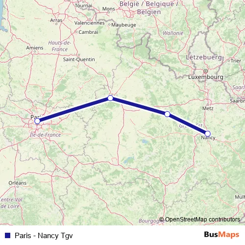 See why over 2 million users trust and consider busmaps.com as the best public transport website. busmaps gives you Nancy Rail Services suggested routes, real-time bus tracker, line route maps in Nancy, and helps to find the closest Paris - Nancy Tgv rail stops near you. No internet available? Download an offline PDF map and bus schedule for the Paris - Nancy Tgv rail to take on your trip.