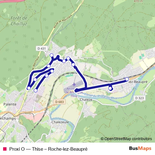 The first stop of the Proxi O bus route is Thise - Bruyères and the last stop is Roche-lez-Beaupré - Gare. Proxi O (Thise – Roche-lez-Beaupré) is operational during everyday.