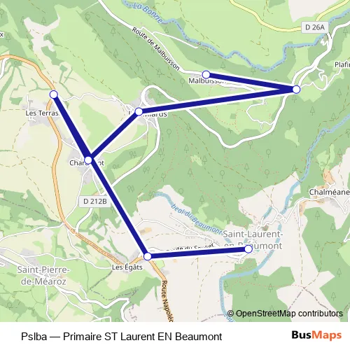 The first stop of the Pslba bus route is Saint-Laurent-en-Beaumont and the last stop is Hameau Malbuisson. Pslba (Primaire ST Laurent EN Beaumont) is operational during everyday.
