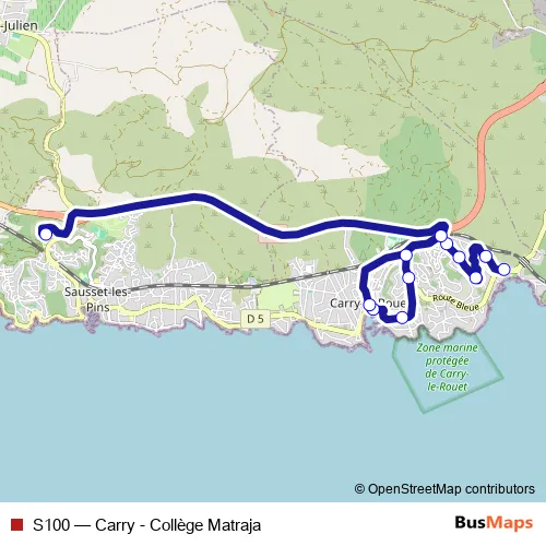 The first stop of the S100 bus route is Rouet Plage and the last stop is Matraja / Les Terrasses. S100 (Carry - Collège Matraja) is operational during on weekdays.