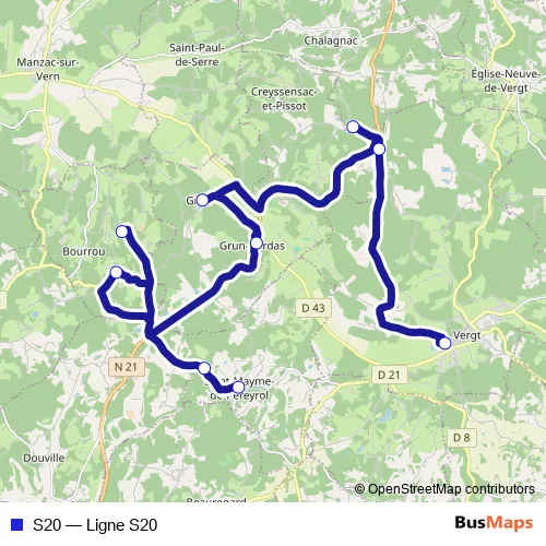 The first stop of the S20 bus route is Vergt - Collège and the last stop is Saint Mayme de Pereyrol - bourg. S20 (Ligne S20) is operational during on weekdays.