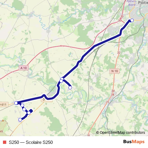 The first stop of the S250 bus route is Lycée du Bois d'Amour and the last stop is Rouillé Grand Breuil. S250 (Scolaire S250) is operational during on weekdays.