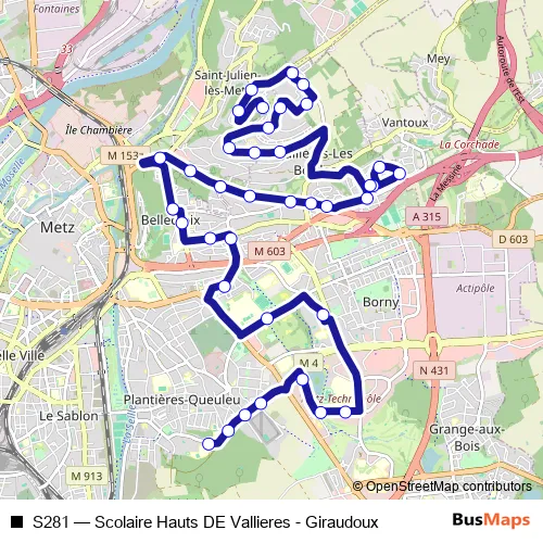 See why over 2 million users trust and consider busmaps.com as the best public transport website. busmaps gives you Metz Buses suggested routes, real-time bus tracker, line route maps in Metz, and helps to find the closest S281 bus stops near you. No internet available? Download an offline PDF map and bus schedule for the S281 bus to take on your trip.