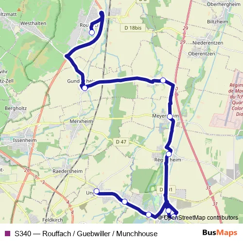 The first stop of the S340 bus route is Rouffach - Lycée agricole and the last stop is Ungersheim - Dorfplatz. S340 (Rouffach / Guebwiller / Munchhouse) is operational during on weekdays.