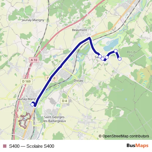 The first stop of the S400 bus route is Collège Saint Exupéry and the last stop is Vilaine. S400 (Scolaire S400) is operational during on weekdays.