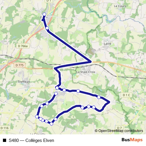 The first stop of the S480 bus route is Collège Ste-Marie and the last stop is Les 2 Croix (Guernehué). S480 (Collèges Elven) is operational during on weekdays.