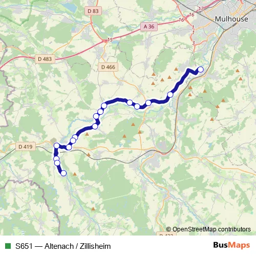 The first stop of the S651 bus route is Zillisheim - College et lycée épiscopal and the last stop is Altenach - Cimetiere. S651 (Altenach / Zillisheim) is operational during on weekdays.