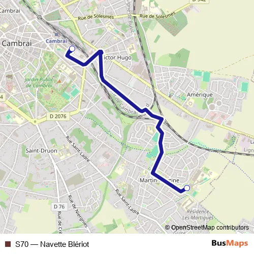 The first stop of the S70 bus route is Cambrai - Lycée Blériot and the last stop is Cambrai - Station Bus (Quai W). S70 (Navette Blériot) is operational during on weekdays.