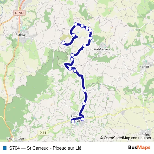 The first stop of the S704 bus route is Collège St-Pierre Ploeuc and the last stop is St-Guihen. S704 (St Carreuc - Ploeuc sur Lié) is operational during on weekdays.