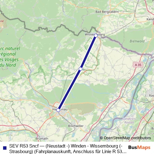 The first stop of the SEV R53 Sncf bus route is Haguenau and the last stop is Wissembourg, Bahnhof. SEV R53 Sncf ((Neustadt -) Winden - Wissembourg (- Strasbourg) (Fahrplanauskunft, Anschluss für Linie R 53 )) is operational during everyday.