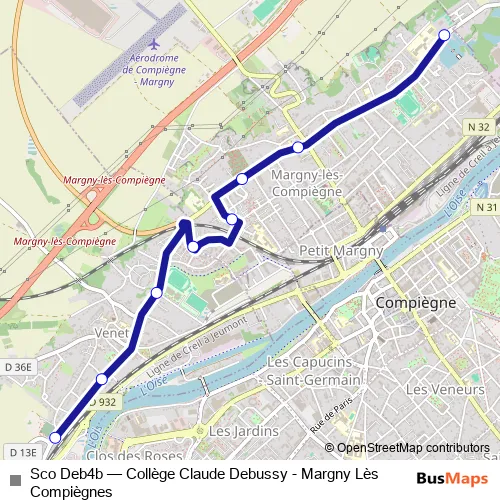 The first stop of the Sco Deb4b bus route is Margny - Collège Debussy and the last stop is Cimetière de Venette. Sco Deb4b (Collège Claude Debussy - Margny Lès Compiègnes) is operational during on weekdays.