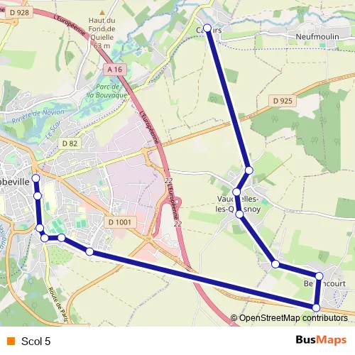 The first stop of the Scol 5 bus route is Caours-Mairie and the last stop is Abbeville-Theatre-404. Scol 5 is operational during on weekdays.
