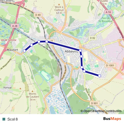 The first stop of the Scol 8 bus route is Rouvroy-Stade-372 and the last stop is Abbeville-Ponth-725. Scol 8 is operational during on weekdays.