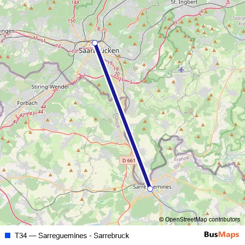 The first stop of the T34 tram route is Sarrebruck and the last stop is Sarreguemines. T34 (Sarreguemines - Sarrebruck) is operational during everyday.