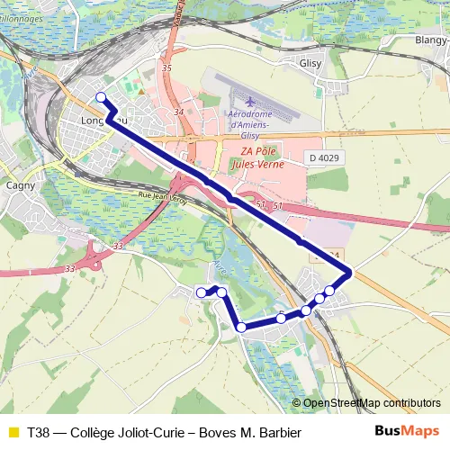 The first stop of the T38 bus route is Collège Joliot-Curie and the last stop is Boves M. Barbier. T38 (Collège Joliot-Curie – Boves M. Barbier) is operational during on weekdays.