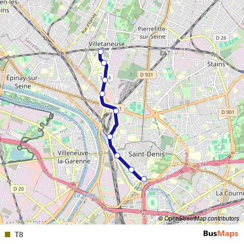 See why over 2 million users trust and consider busmaps.com as the best public transport website. busmaps gives you Saint-Denis Trams suggested routes, real-time bus tracker, line route maps in Saint-Denis, and helps to find the closest T8 tram stops near you. No internet available? Download an offline PDF map and bus schedule for the T8 tram to take on your trip.