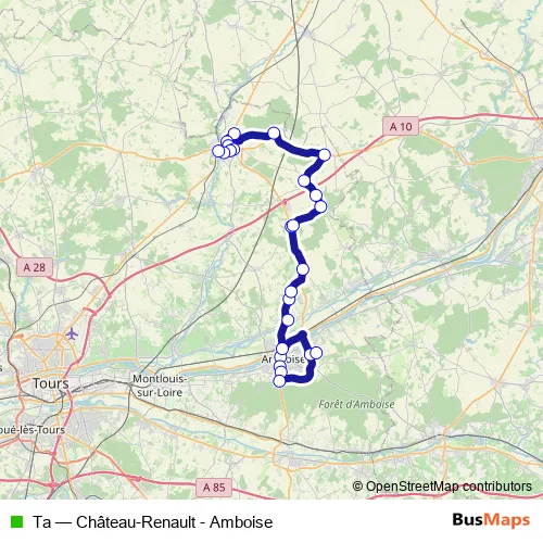 The first stop of the Ta bus route is Max Ernst and the last stop is Gare - Caserne des pompiers. Ta (Château-Renault - Amboise) is operational during on weekdays.