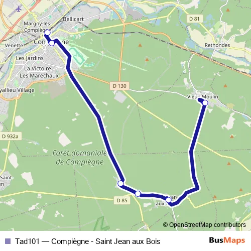 The first stop of the Tad101 bus route is Vieux-Moulin and the last stop is Gare-Quai de la République. Tad101 (Compiègne - Saint Jean aux Bois) is operational during everyday.