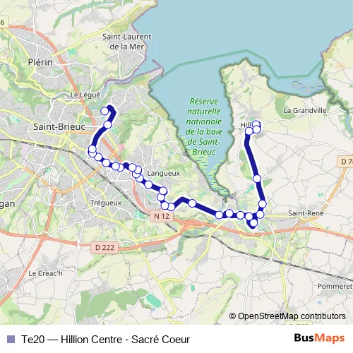 The first stop of the Te20 bus route is Route de la Grandville and the last stop is Sacré-Coeur. Te20 (Hillion Centre - Sacré Coeur) is operational during on weekdays.