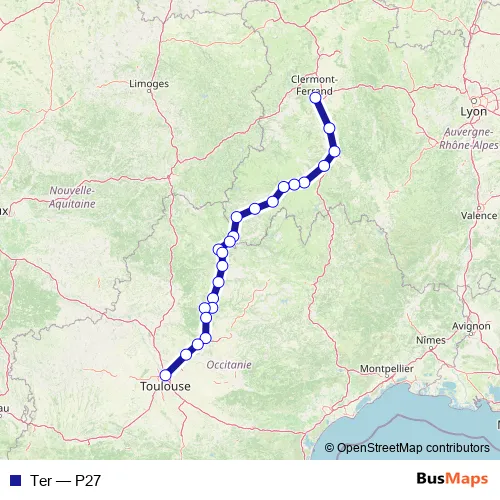 The first stop of the Ter rail route is Clermont-Ferrand and the last stop is Toulouse-Matabiau. Ter (P27) is operational during everyday.