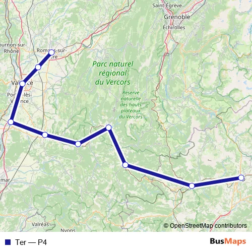 The first stop of the Ter rail route is Gap and the last stop is Romans - Bourg-de-Péage. Ter (P4) is operational during everyday.