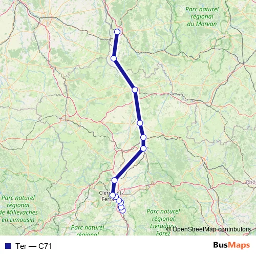 The first stop of the Ter rail route is Vic-le-Comte and the last stop is Nevers. Ter (C71) is operational during everyday.