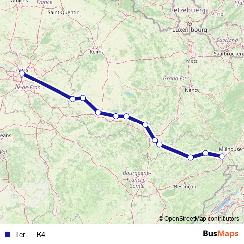 The first stop of the Ter rail route is Belfort and the last stop is Paris-Est. Ter (K4) is operational during everyday.