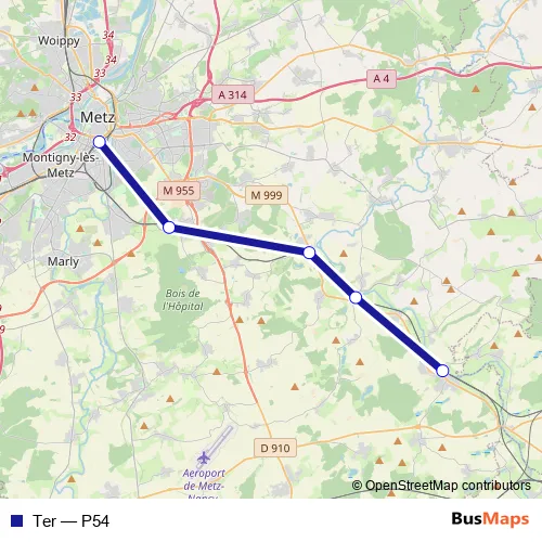 The first stop of the Ter rail route is Rémilly and the last stop is Metz Ville. Ter (P54) is operational during on weekdays.