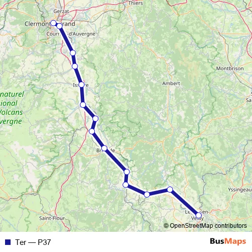 The first stop of the Ter rail route is Le Puy-en-Velay and the last stop is Clermont-Ferrand. Ter (P37) is operational during everyday.