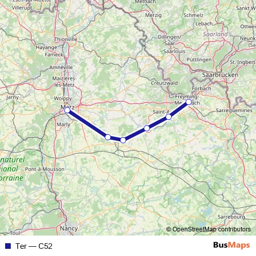 The first stop of the Ter rail route is Béning-lès-Saint-Avold and the last stop is Metz Ville. Ter (C52) is operational during on weekdays.