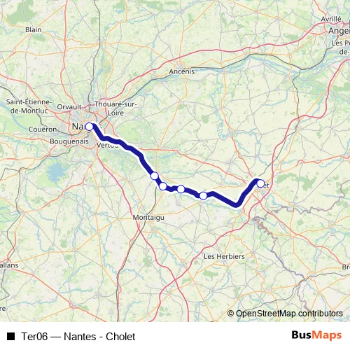 The first stop of the Ter06 rail route is Gare de Nantes and the last stop is Gare de Cholet. Ter06 (Nantes - Cholet) is operational during everyday.