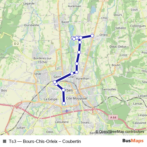 The first stop of the Ts3 bus route is Coubertin and the last stop is Orleix - Alouettes. Ts3 (Bours-Chis-Orleix – Coubertin) is operational during on weekdays.