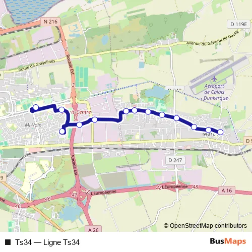 The first stop of the Ts34 bus route is Lycee Leonard DE Vinci and the last stop is Marck Mairie. Ts34 (Ligne Ts34) is operational during everyday.