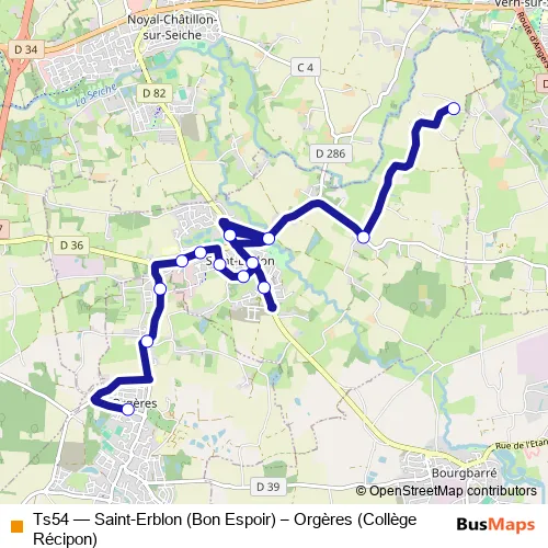 The first stop of the Ts54 bus route is Collège Récipon and the last stop is Bon Espoir. Ts54 (Saint-Erblon (Bon Espoir) – Orgères (Collège Récipon)) is operational during on weekdays.
