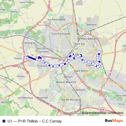 The first stop of the U1 bus route is C.C. Cernay and the last stop is P+R Thillois. U1 (P+R Thillois – C.C Cernay) is operational during everyday.